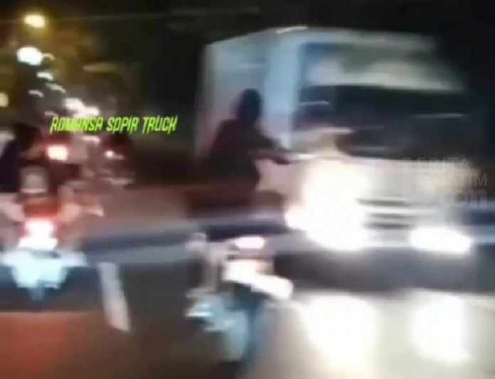 Menit berikutnya mereka mendadak berpapasan dengan truk dari arah berlawanan. Seorang penumpang yang dibonceng tiba-tiba berdiri di atas motor yang masih melaju dan langsung memukul truk tersebut dengan benda mirip tongkat.