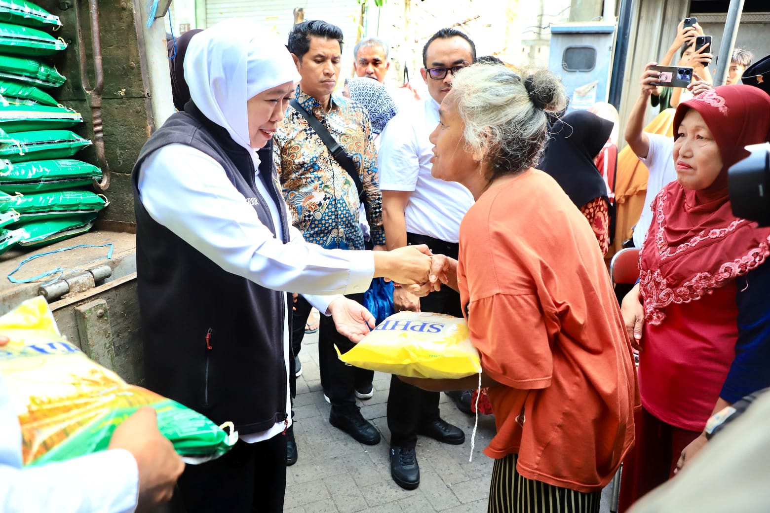 Tak sekadar mengecek harga dan stok bahan pokok di Pasar Pangan Murah Ramadhan saja, Khofifah juga membagikan bantuan sembako berupa telur dan beras kepada ibu-ibu.