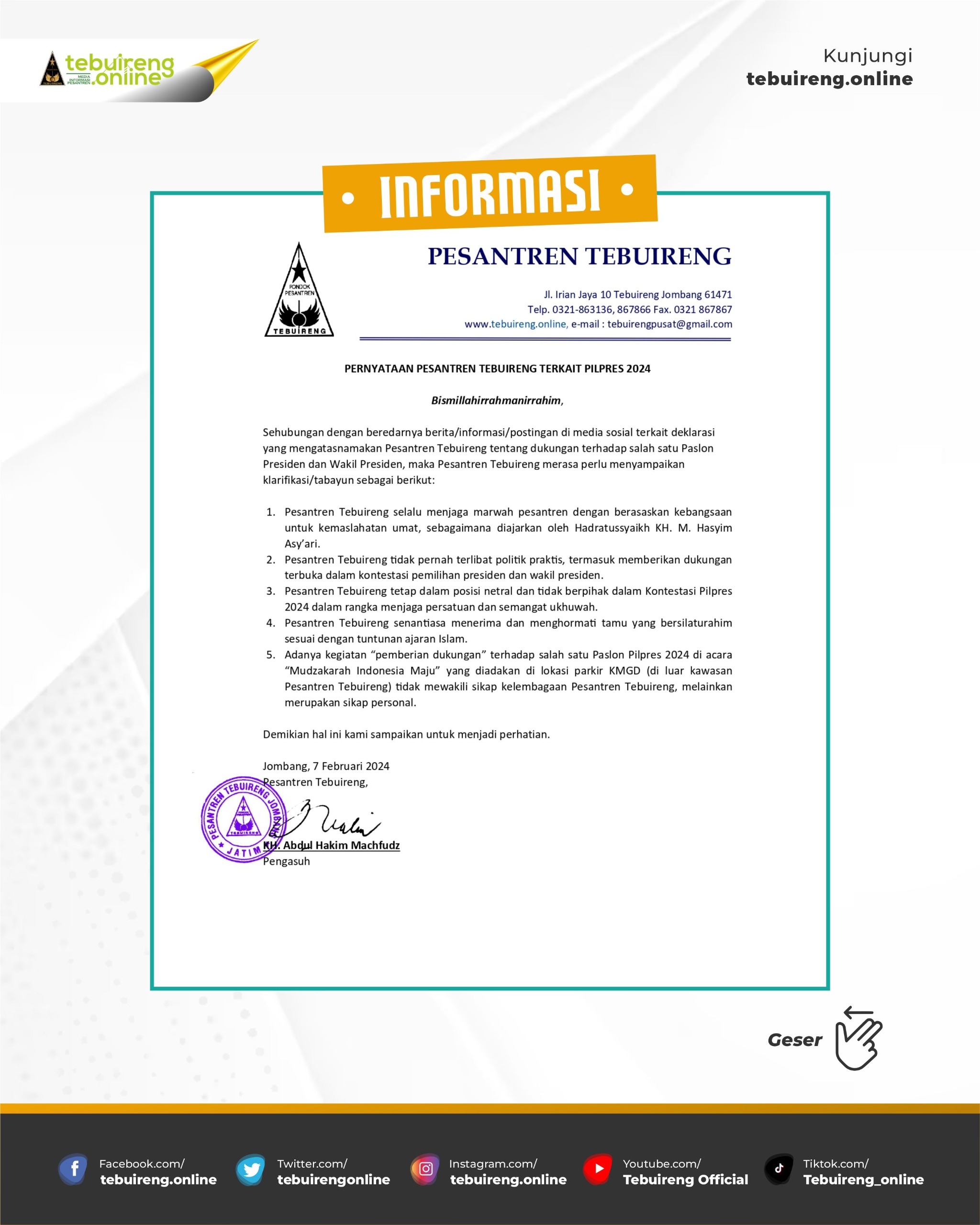 Netral, Ini Sikap Resmi Pesantren Tebuireng Pada Pilpres 2024